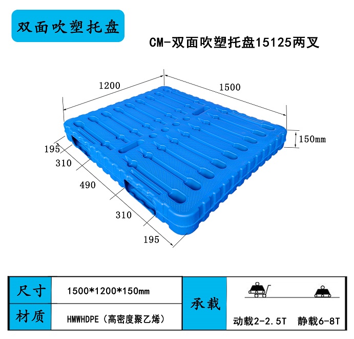 中空吹塑塑料托盤的生產(chǎn)與一般的中空制品吹塑成型方法相類似,因其產(chǎn)品較大,且為雙面型,需要較大的擠出機、合模機及模具等。目前國內(nèi)中空成型機制造廠家已經(jīng)研發(fā)出專業(yè)高速生產(chǎn)高強度吹塑托盤的超大型中空成型機,采用HDPE(低壓高密度聚乙烯)高強度塑料生產(chǎn),成型速度較快,產(chǎn)品質(zhì)量較好,具有高強度、壽命長的特點,一般吹塑托盤的使用壽命可以達到5~10年,同時可以在-40~70℃的環(huán)境下穩(wěn)定工作。其產(chǎn)品的動載可以達到3t以上,抗彎強度均是較高的水平。是高強度使用環(huán)境的首選托盤,目前其價格比注塑托盤偏高一些,但其使用壽命特別長,所以它的性價比是所有托盤中最高的。吹塑托盤隨著成型設(shè)備價格的大幅度降低,將會在近年內(nèi)獲得較快的發(fā)展。將對于節(jié)約有限的石油資源與物流成本有極大的好處。